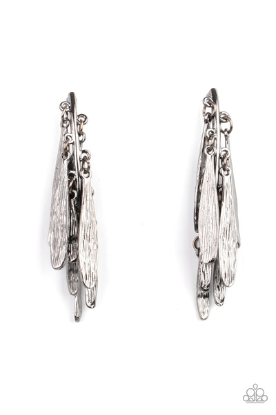 Textured petal-like plumes cluster around a curved gunmetal bar and dance in an unexpected funky fringe below the ear. Earring attaches to a standard post fitting.